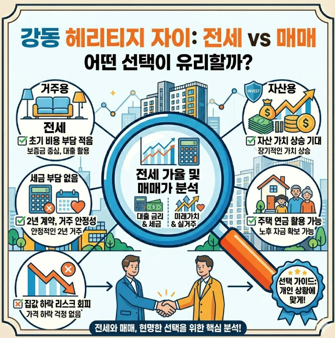 결국 강동 헤리티지 자이 전세와 매매 어떤 선택이 유리할까라는 질문에서, 아직 상황이 확정되지 않은 사람이라면 전세가 더 합리적인 선택이 될 가능성이 큽니다.