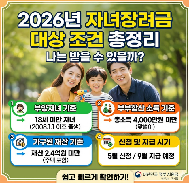 2026년 자녀장려금 대상 조건을 따질 때 가장 중요한 기준은 소득, 재산, 자녀, 그리고 기본 자격입니다. 국세청 기준상 2026년 정기신청은 2025년 연간 소득을 기준으로 심사하며, 가구원 모두의 재산 합계액은 2025년 6월 1일 기준 2억 4천만 원 미만이어야 합니다. 여기에 부부합산 총소득이 7,000만 원 미만이어야 하고, 신청 가능한 자녀는 18세 미만의 부양자녀여야 합니다. 즉, 2026년 자녀장려금 대상 조건은 단순히 아이가 있다고 되는 것이 아니라, 소득과 재산까지 함께 맞아야 한다는 점이 핵심입니다.